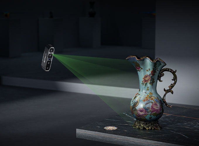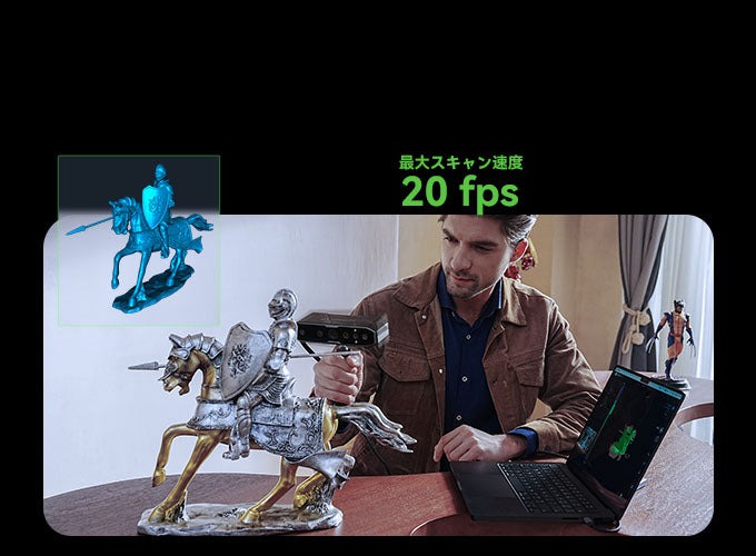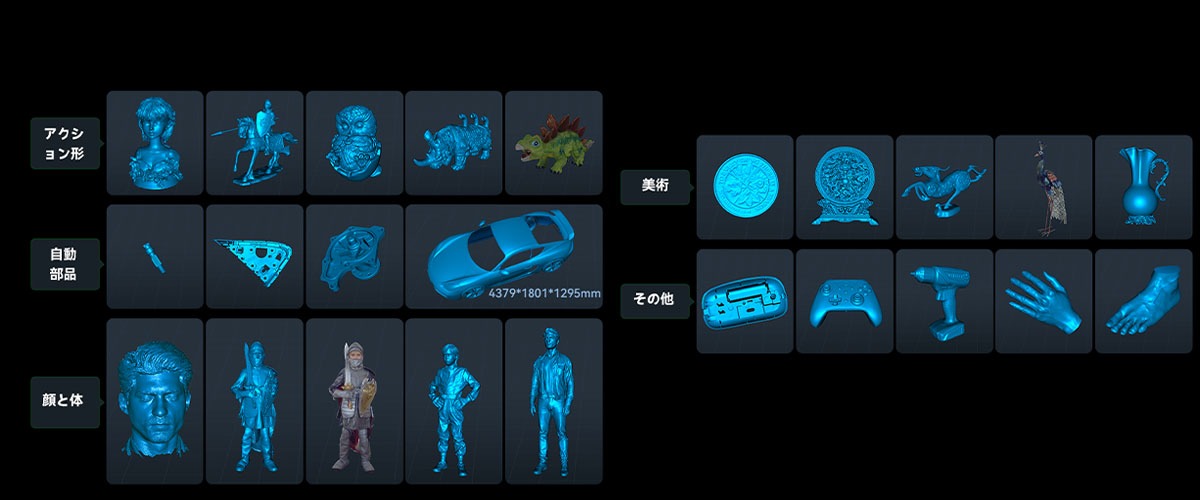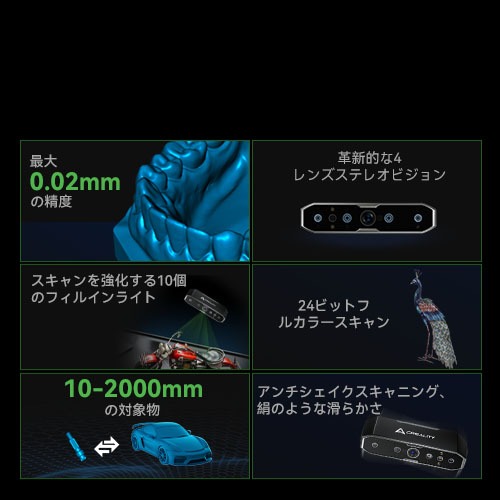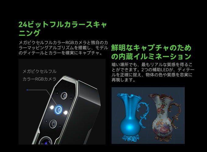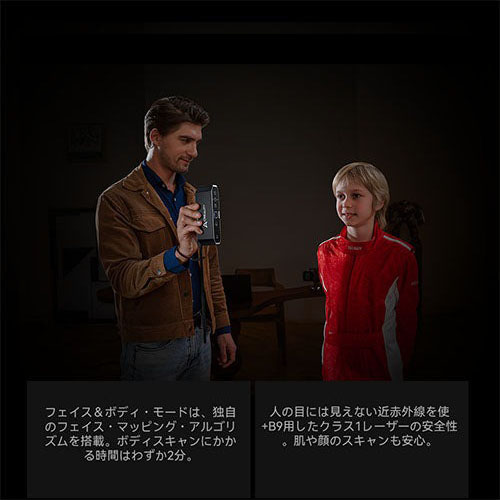 ・最大0.02mmの精度 ・革新的な4レンズステレオビジョン ・10x10x10~2000x2000x2000mmの対象物に対応 ・24ビットフルカラースキャン ・スキャンを強化する10個のフィルインライト (カラー補助用白色LED x2、マーカー認識用赤外線LED x8) ・アンチシェイクスキャニングで、トラッッキングロスを低減。 |