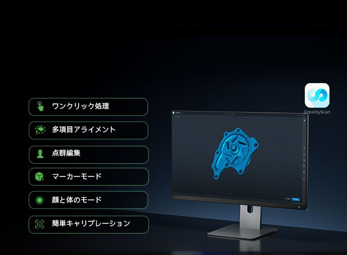 ・3Dスキャナー用ワイヤレスハンドル ・Wifi6 AX6000で高速データ通信 スキャンデータをWifi経由でPCに高速転送 ・ワイヤレス スクリーン ミラーリング スキャンした画像をモバイルデバイスにリアルタイム表示 ・Creality Scan スマートフォン アプリケーション対応 スマートフォン上からの直接スキャンをサポート ・大容量 & 高速充電 36000 mWh バッテリー内蔵 わずか1.5時間で80%まで高速充電。最大4時間の連続スキャン ・インテリジェントな省電力 デバイスが一定時間アイドル状態になるとデバイスの電源を 自動的にオフ |